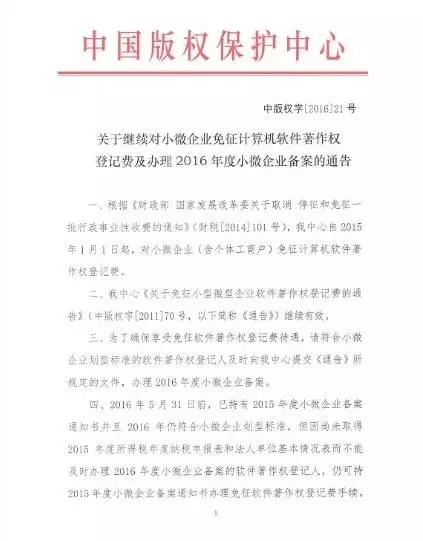 【通知】繼續(xù)對小微企業(yè)免征計算機(jī)軟件著作權(quán)登記費(中版權(quán)字 [2016] 21號)